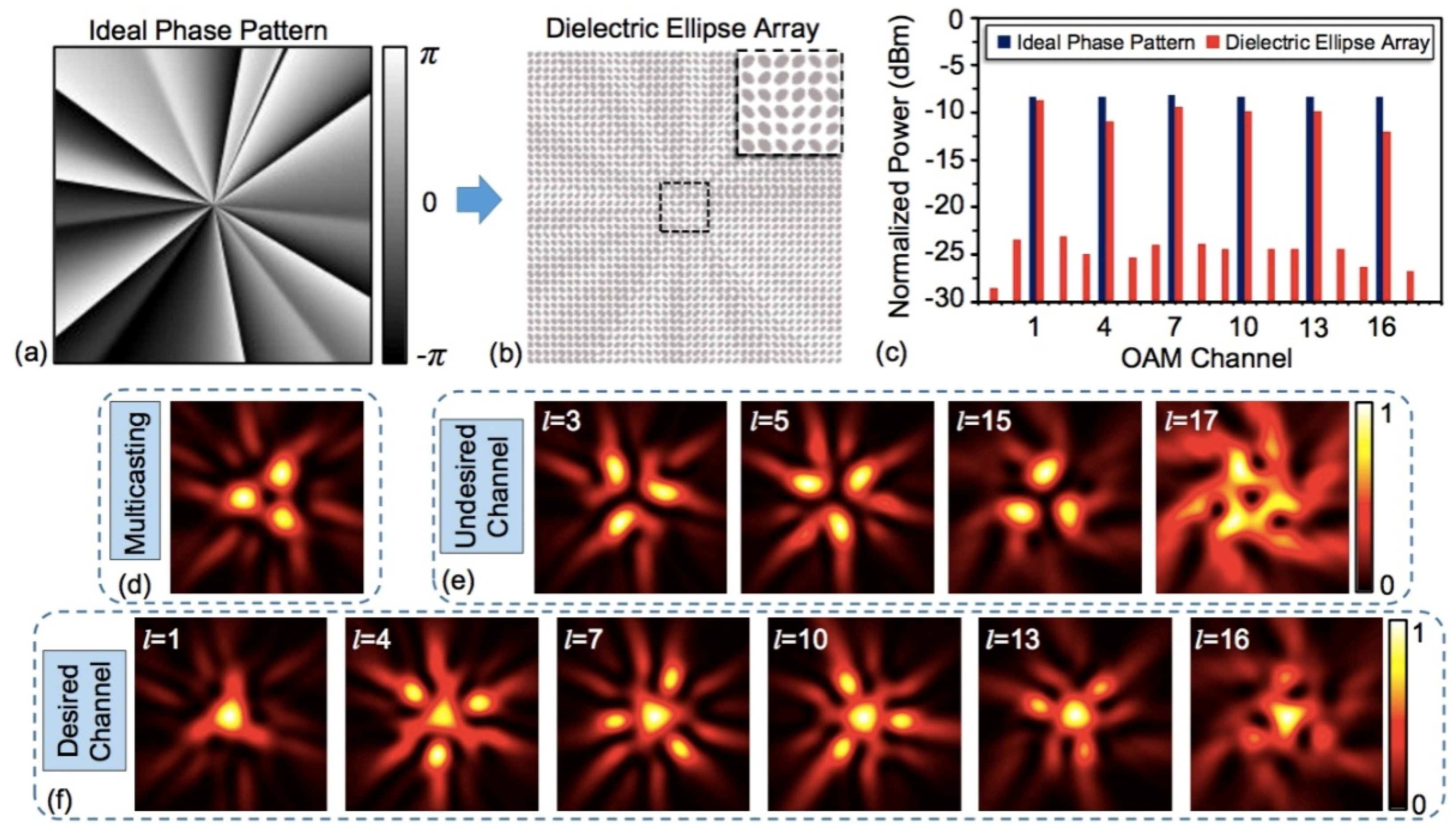 Moreover, six-fold OAM multicasting using the designed dielectric ellipse metasurfaces is also simulated. The ideal phase pattern to generate collinearly superimposed six OAM beams (l = 1, 4, 7, 10, 13, 16) is plotted in Figure 27a. By replacing the ideal phase pattern with corresponding resonators, we design the dielectric ellipse array shown in Figure 27b. Figure 27d depicts the intensity distribution of the superimposed multiple OAM modes generated by the designed ellipse array, which has a trigonal dark center. After de-multicasting, the intensity distribution of OAM channels is plotted in Figure 27e,f. For multicast OAM channels, there exists a bright spot at the beam center (Figure 27f), while for undesired channels, there is a dark region at the center (Figure 27e). Crosstalks for all OAM channels, defined as the power ratio of the desired OAM channel (e.g., l = 4) to its neighboring ones (e.g., l = 3 and l = 5), are less than −14 dB, as shown in Figure 27c.