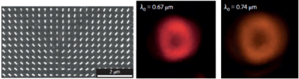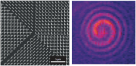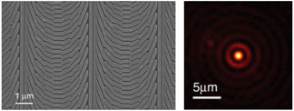 OAM beam generation using dielectric metasurface at 980 nm: We further design, fabricate and test the dielectric ellipse metasurface arrays at a wavelength of 980 nm. Figure 24 shows the experimental results of the fabricated dielectric ellipse metasurface arrays. Figure 24a plots the measured intensity profiles of the generated OAM beams of l = 1–4 using the fabricated metasurface arrays. Figure 24b exhibits the measured intensity profiles of generated OAM beams after being interfered by Gaussian beam. One can clearly see from Figure 24b that the number of helical arms in the distribution of the interference intensity is equal to the topological number 𝑙 of the OAM beam, indicating the favorable results.