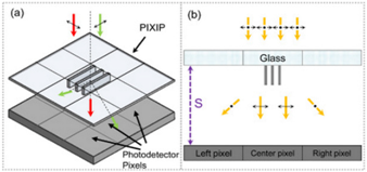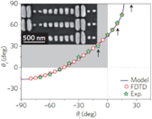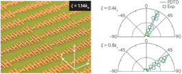 We design and fabricate a kind of chip-scale dielectric metasurface array on a silicon-on-insulator (SOI) platform. Figure 19 shows the schematic drawing of the proposed dielectric metasurface units, consisting of rectangle or ellipse silicon resonators with various dimensions. The working principle of these proposed dielectric resonators can be explained as follows: the polarization of incident light is along the x axis, which can be decomposed into two perpendicular components corresponding to the long and short axis of the resonator, respectively; the reflection amplitudes of the response for a resonator in both components are almost the same, while the relative phase retardation is around π, where the linear polarization conversion occurs, resulting in a y-polarized reflected light.