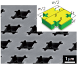 Plasmonic metasurfaces are composed of metal nanoparticles based on the plasmon resonances. Several typical types of plasmonic metasurfaces and previous works are displayed in Table 1: (1) metal V-shaped nano-antennas are designed and fabricated on silicon substrate using the electron-beam lithography method to manipulate the phase of scattering light and to generate OAM beams [34]; (2) Au patch antennas separated from a metal back plane by a MgF2 spacer are designed and fabricated using the electron-beam evaporation electron-beam lithography technique to realize anomalous reflections [81]; (3) metal H-shaped nano-antenna arrays are designed and fabricated using printed circuit boards to realize high efficiency conversion from propagating waves to surface waves in the microwave regime [82]; (4) metal nanorods are deposited on a glass substrate to generate a hologram [95]; (5) freestanding nanofabricated fishnet metasurfaces are designed and fabricated using the electron-beam lithography method to realize a broadband band pass filter [96]; (6) metal rectangular apertures are arranged in an array with rotational symmetry in metal film to generate OAM beams [98]; (7) metal nanorods are designed and fabricated on glass substrate with a standard electron-beam lithography and lift-off process to generate broadband OAM beams [99]; (8) metal split-ring resonators are designed and fabricated on glass substrate with a standard electron-beam lithography to enhance second harmonic generation [102]. All of these works are based on manipulating the plasmon responses of nano-resonators by altering the dimensions, directions and even arrangement of unit structures. Recently, we have also made some progresses in plasmonic metasurfaces on the basis of previous works.