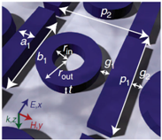 Design: We propose and design compact metal-assisted metasurfaces to enable broadband generation of OAM-carrying vector beams. Figure 3a,b depicts the structure and geometric parameters of metal-assisted metasurfaces. We design two concentric rings in a gold film with a thickness of h = 200 nm. Each ring is composed of 42 rectangular apertures with gradually-varied orientation. The rectangular aperture array in the gold film can enhance the transmission of linearly-polarized light (perpendicular to the aperture direction), which might be explained as follows: (i) the localized waveguide resonance (each air aperture can be regarded as a truncated rectangular waveguide with four metal walls and two sides open to air); (ii) the property of the surface plasmon resonance due to the aperture array. Hence, each rectangular aperture can be regarded as a localized linear polarizer. By controlling the orientation angle of rectangular apertures, we can construct the desired spatially-variant polarizers to generate OAM-carrying vector beams with a right or left circularly-polarized input light beam. Figure 3c shows an example of the phase front and spatial polarization after passing though the metasurfaces, which indicates the generation of the OAM-carrying vector beam from the circularly-polarized beam.