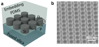 Fabrication: The proposed rectangle and ellipse dielectric metasurfaces can be fabricated using the existing fabrication techniques on the SOI platform. Figure 25a shows the schematic diagram of the fabrication process of the proposed rectangle and ellipse dielectric metasurfaces: standard electron-beam lithography to form patterns followed by induced coupled plasma silicon etching. Figure 25b displays the scanning electron microscope (SEM) details of the top view of a fabricated dielectric ellipse metasurface array to generate the OAM beam.