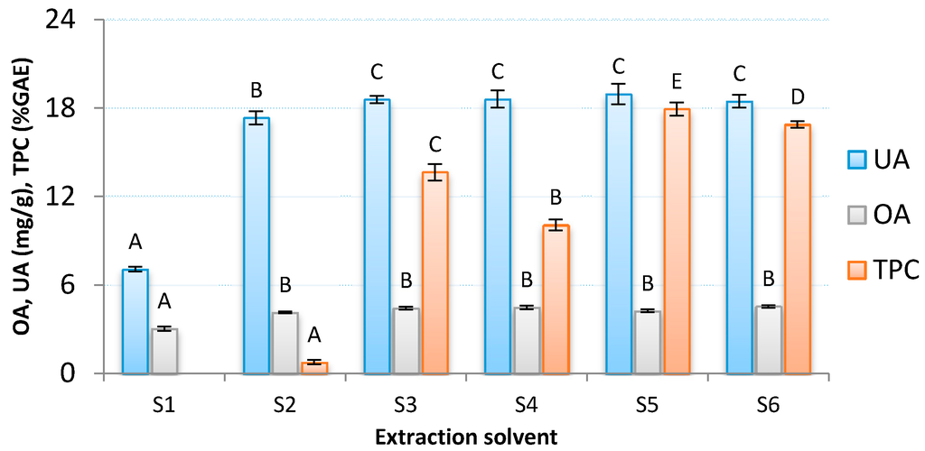 Content of OA, UA, and polyphenols (TPC) in the leaves of A. uva ursi as calculated per dry weight basis in extracts obtained with different solvents: S1, n-hexane (3 × 30 mL); S2, chloroform (3 × 30 mL); S3, chloroform-methanol 1:1 (3 × 30 mL); S4, chloroform (2 × 30 mL) + chloroform-methanol 1:1 (30 mL); S5, methanol (3 × 30 mL); and S6, n-butanol (3 × 30 mL). Values are presented as means (n = 3) ± standard deviation (error bars). Different superscripts (capitals, A–E) for each analyte indicate significant differences in the means at p < 0.05.
