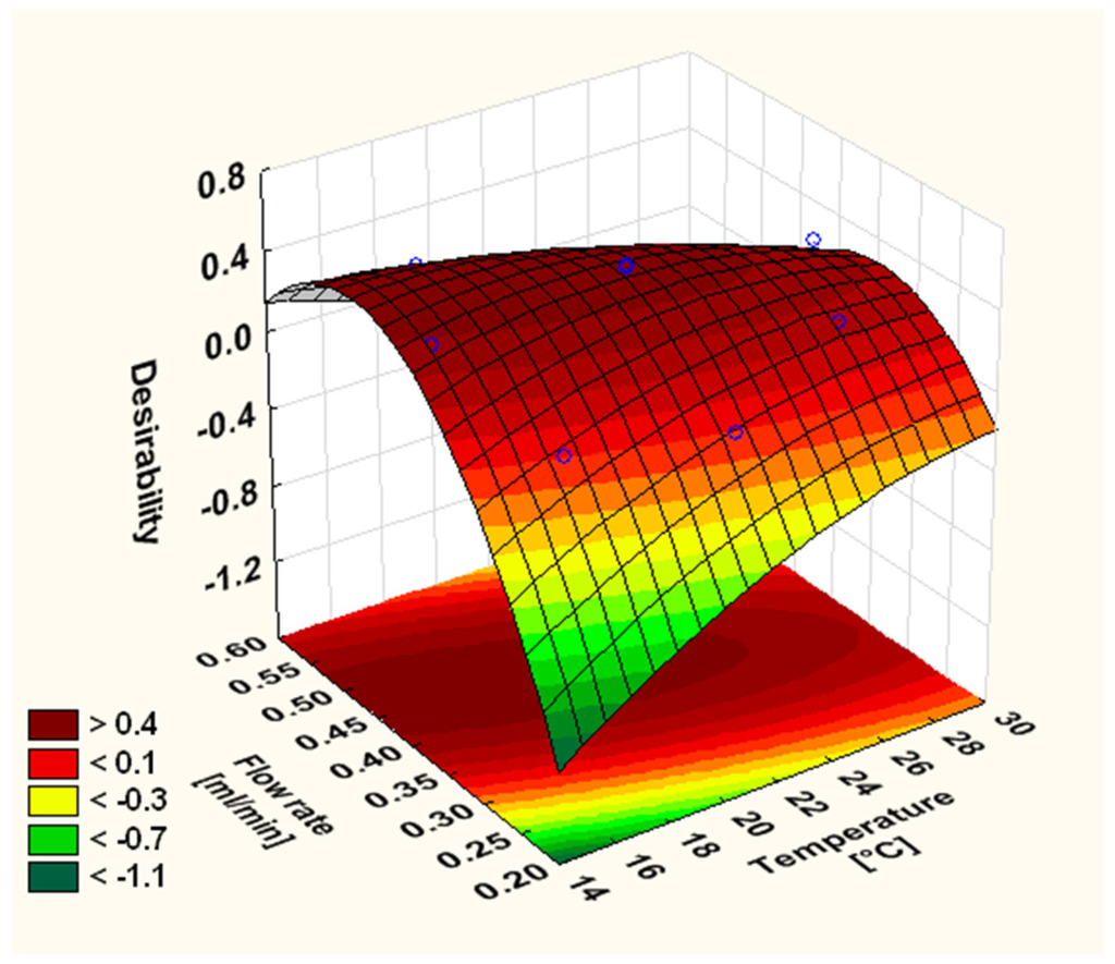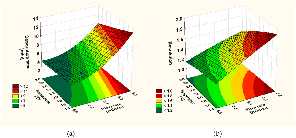 The flow rate and temperature are further factors that can easily allow changing the separation efficiency. According to the basics of chromatography, elevation of temperatures reduces eluent viscosity and the observed backpressures, improves the sorption kinetics, increases the mass transfer and longitudinal diffusion, which result in shorter analysis times, but the resolution could suffer, especially for small molecules [43]. A similar effect (shorter time, but worse resolution) could be achieved by increasing the flow rate. The efficient combination of the two factors is a key to successful separation. The thorough examination of all combinations, even with only two factors to consider, can be time consuming and might not necessarily provide an optimal solution. Therefore, to facilitate the optimisation process, an experimental design was used.