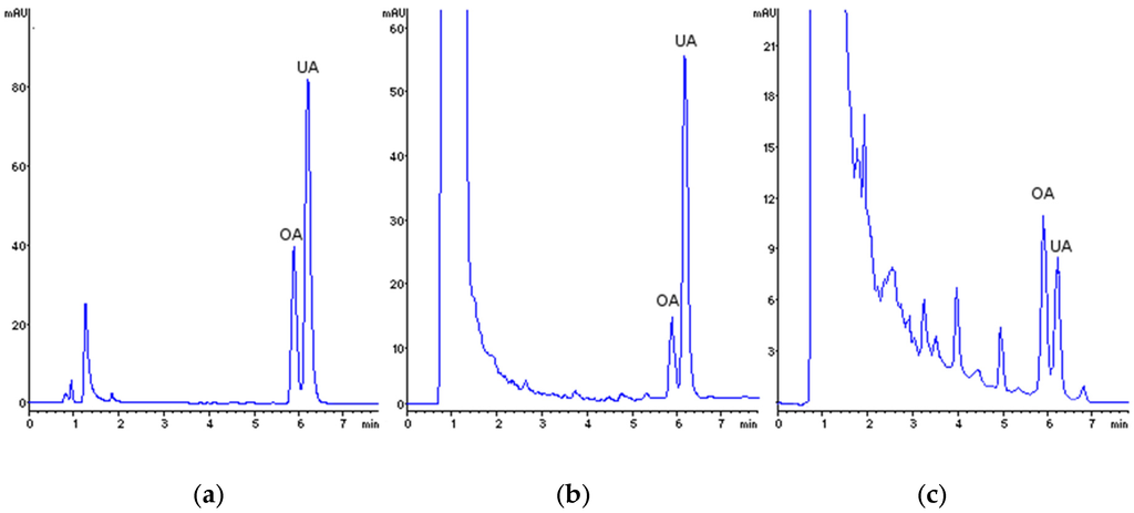 Selectivity of the method and peak purity were analysed by the comparison of retention times and UV-VIS spectra with reference compounds using an automated match system. The comparison of the spectra upslope, apex, and downslope, and between the peak spectral data at different wavelengths confirmed that all analyte peaks of the real samples eluted as pure bands. Representative chromatograms (Figure 5), including that of the most complex extract of V. myrtillus, show good resolution of the matrix peaks and high selectivity of the developed method for the quantification of OA and UA.