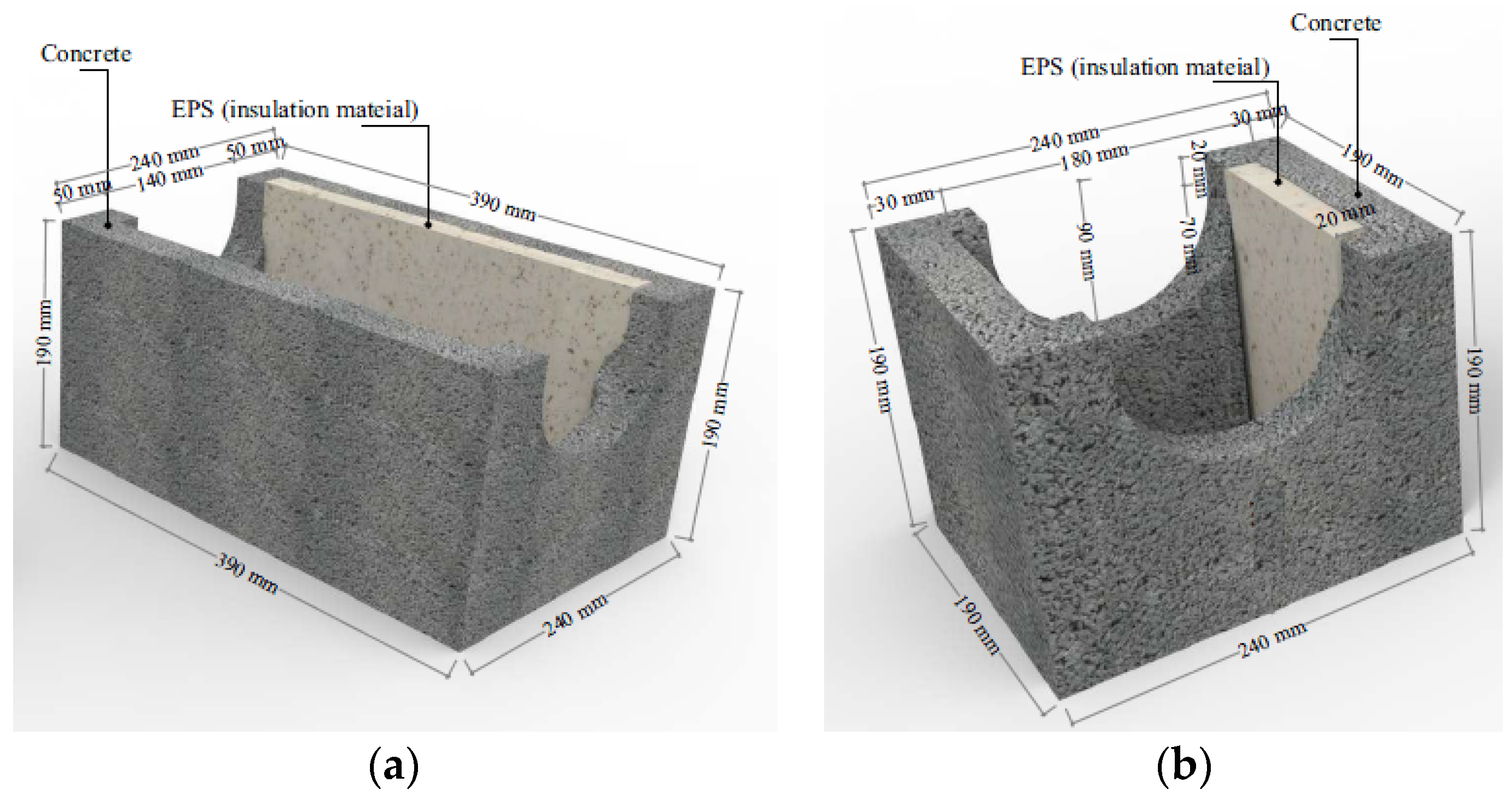 12]. Inserting insulation material such as EPS into normal-weight concrete with a special configuration of concrete masonry units (CMUs) leads to an increase in their thermal resistance without affecting their mechanical performance [