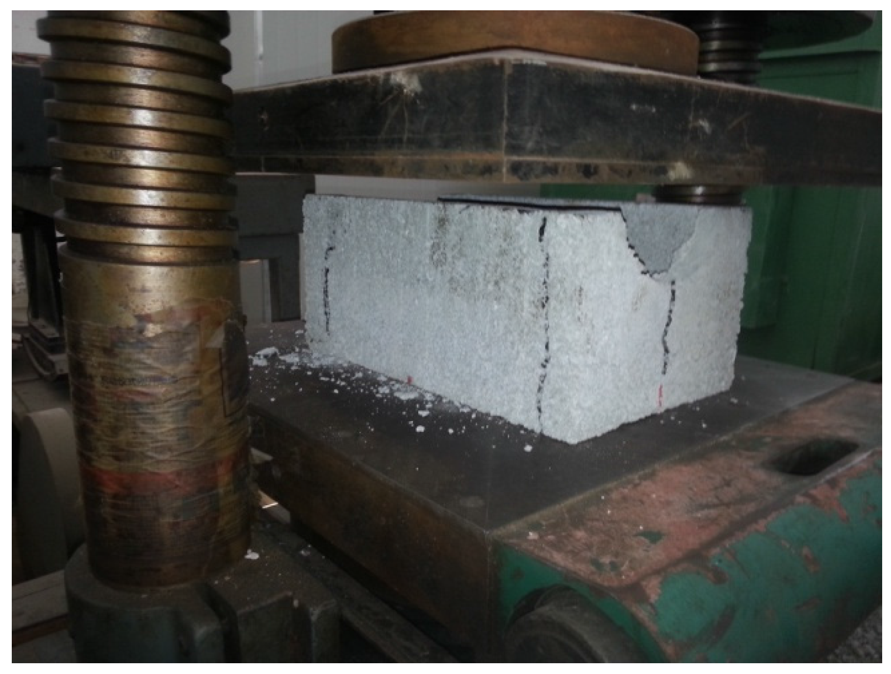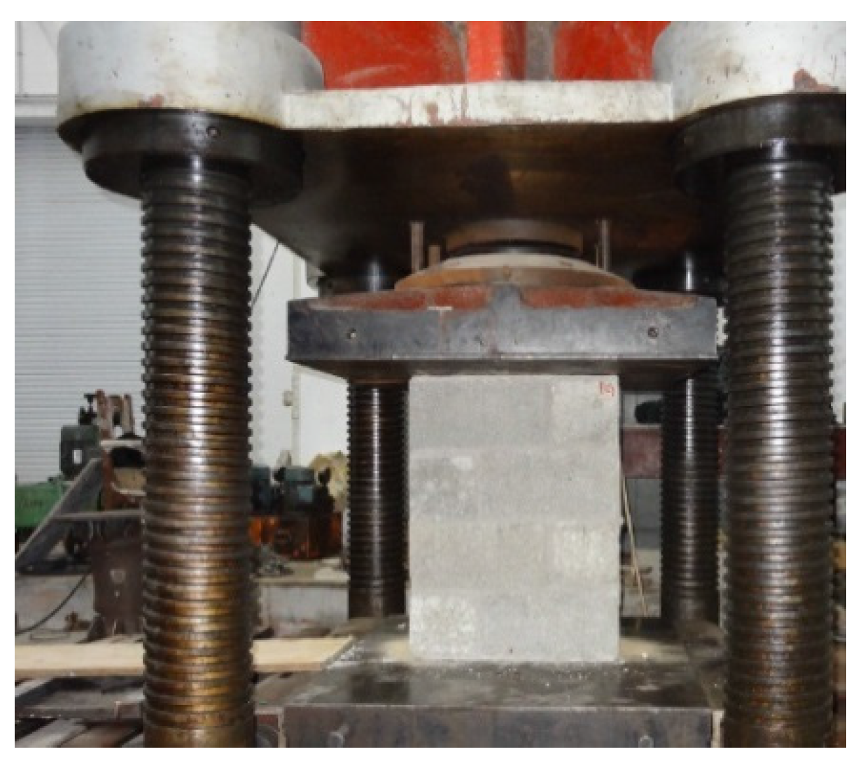 The compressive strength test was performed using a universal machine (Jinan Time Shijin Instruments Co., Ltd., Jinan, China) with capacity of 5000 kN and loading rate of 0.05 ± 0.01 N/mm