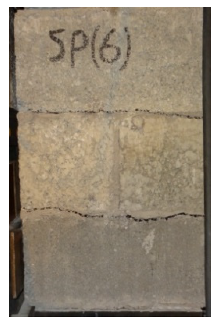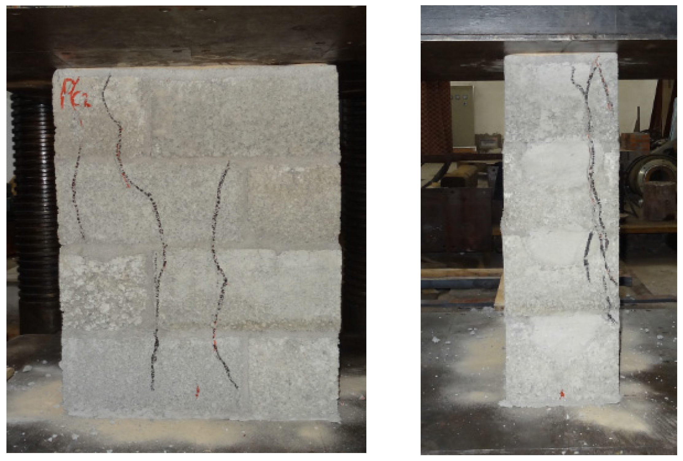 Figure 5. It was observed that the prisms failed due to the development of vertical cracks along their height. Apparently, the lateral expansion of the mortar induced high tensile stresses in the blocks, causing them to crack and eventually fail. Generally, the pattern of failure is influenced by the modulus of elasticity of the different materials that made up the masonry system [