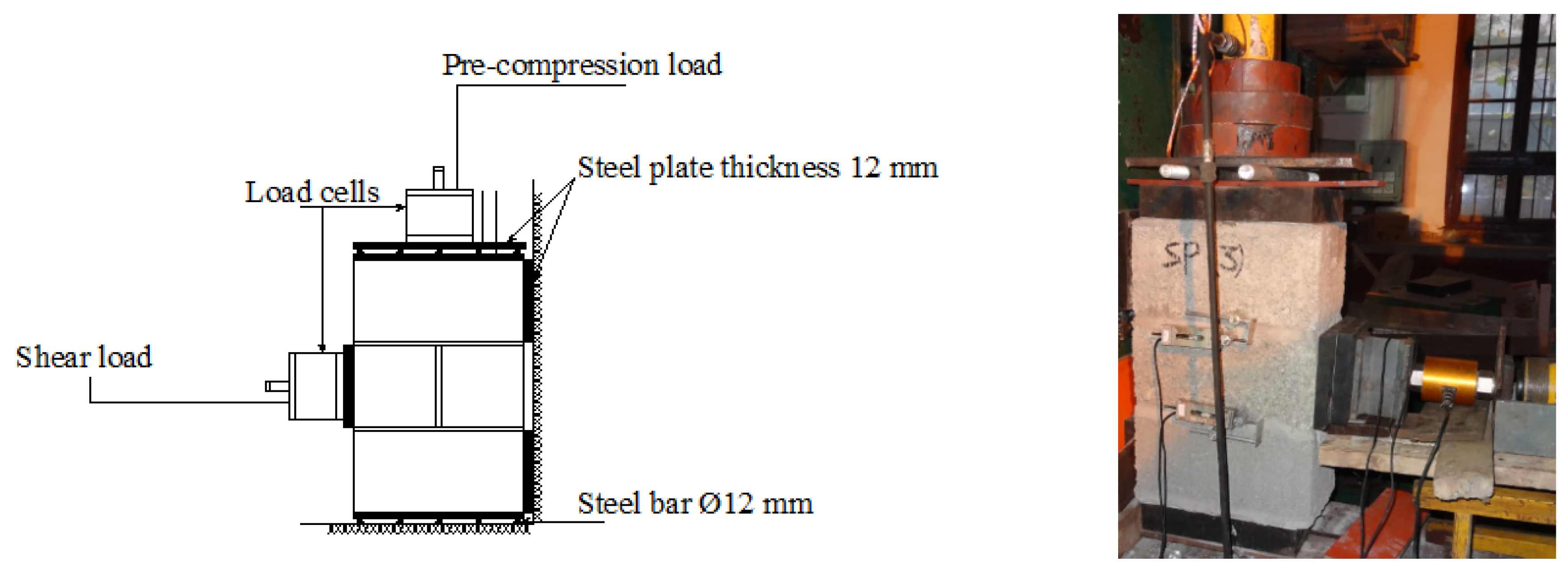 Shear strength test was performed using two load cells. One load cell (Shanghai Huali Sensor Technology Co., Ltd., Shanghai, China) was used to apply a constant vertical precompression load while the second load cell (Shanghai Huali Sensor Technology Co., Ltd., Shanghai, China) was used to apply an increasing horizontal load. Steel plates were installed to ensure a uniform distribution of load and to control the location of supporting points.