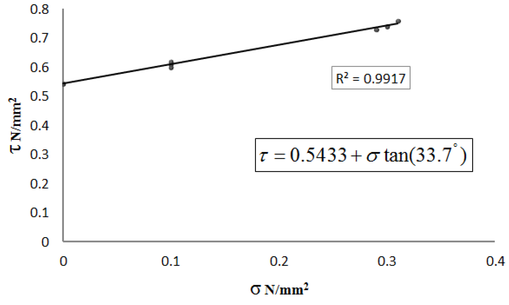 Figure 9, which has been obtained from a linear regression of points. The average cohesion and friction angle in the bed joints of the SCMU prisms are, respectively, 0.5433 N/mm
