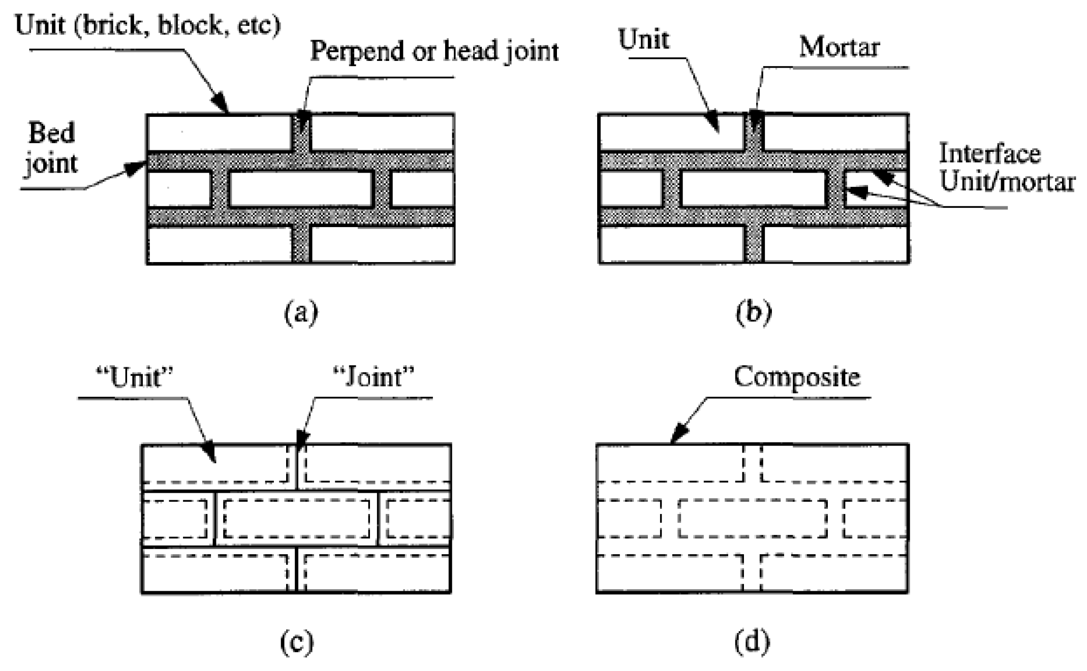 Figure 10, to model a masonry structure with FEM, which includes macro- and micro-modeling. The macro-model is based on the assumption of homogenous materials, and the mortar joints and units can be smeared into one isotropic or anisotropic material. This procedure may be preferred for the analysis of large masonry structures due to the reduced time and memory requirements as well as a user-friendly mesh generation. In addition, this type of modeling is most valuable when a compromise between accuracy and efficiency is needed [