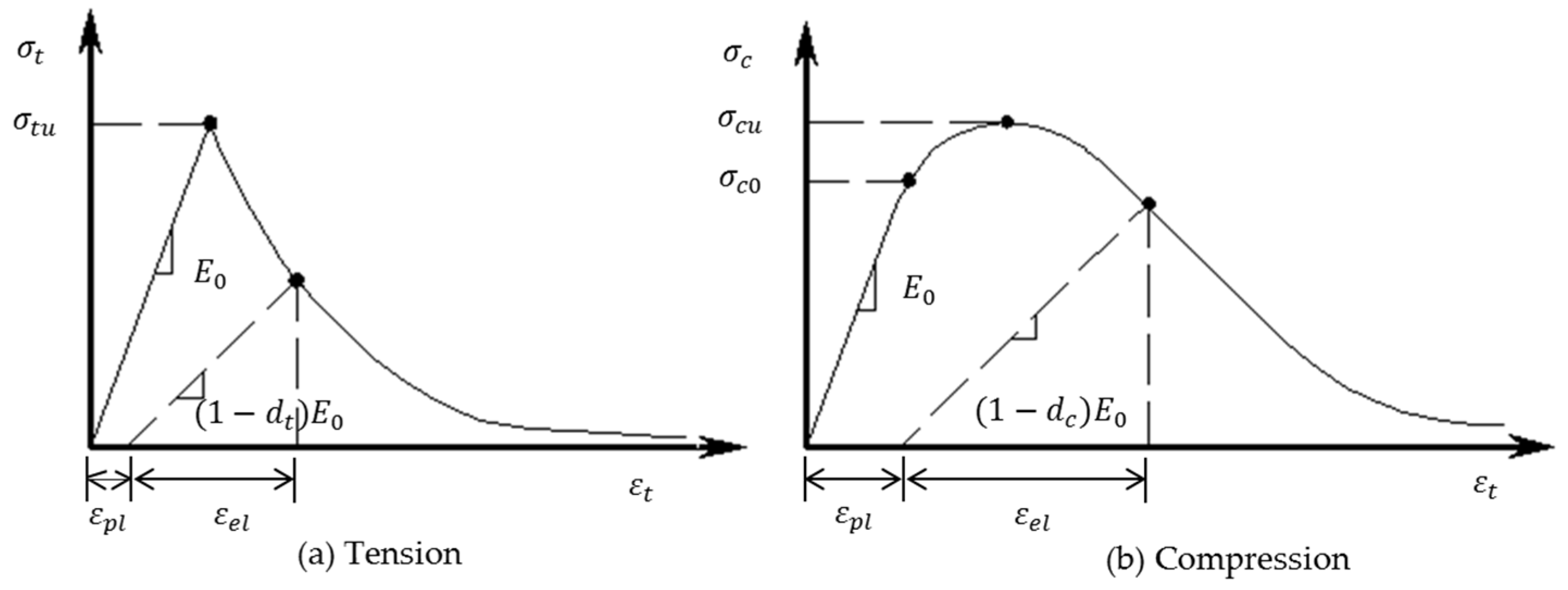 29]. The failure modes of this model are cracks in tension or crushing in compression. The stress–strain relationship and corresponding damage parameters for the validation models used in this study were based on primary models proposed by Lubliner et al. [