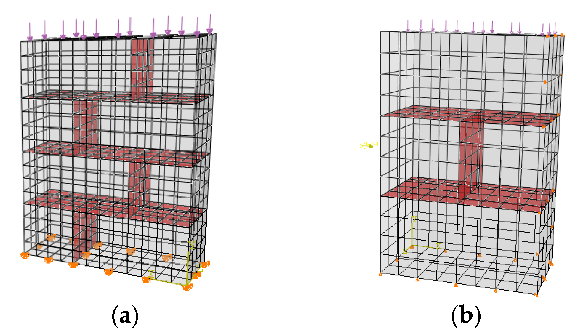 (3) Using a simplified micro-modeling strategy for grouted masonry assemblages gave accurate results with a simple model procedure. Furthermore, the mortar joints were modeled with zero thickness and their behavior was simulated using the traction–separation model of the cohesive element.