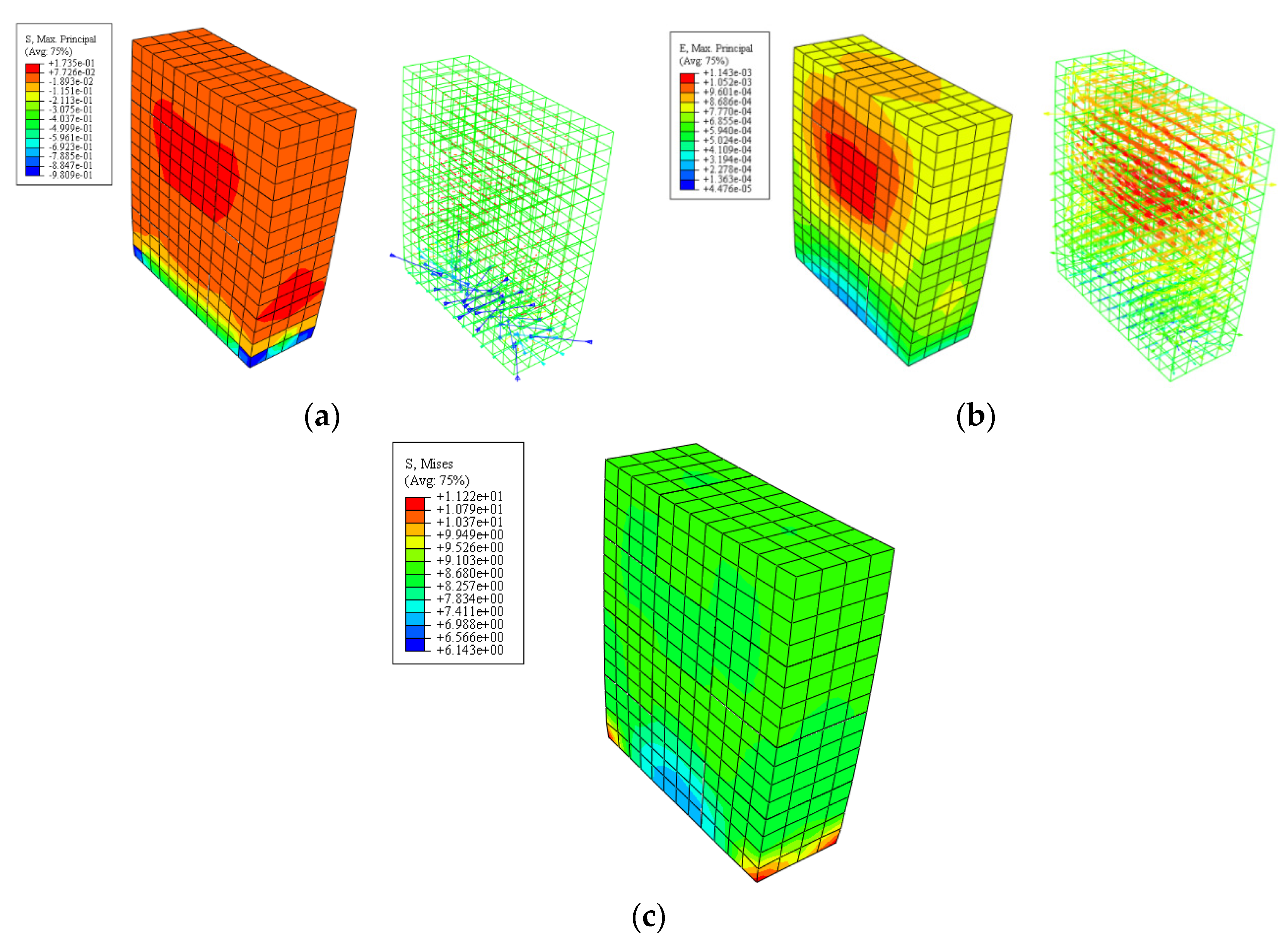 Figure 15 shows the final von Mises and maximum principal stress and strains for compression prism. As can be seen, the maximum stress occurred at the bottom edges of prism, while the maximum strain is located at the middle of the prism. Obviously, this leads to the initiation of vertical tensile splitting cracks at the middle of the prism and spreading to the top and bottom units, which is similar to what was found experimentally. The maximum stress obtained from the numerical model was 8.67 N/mm
