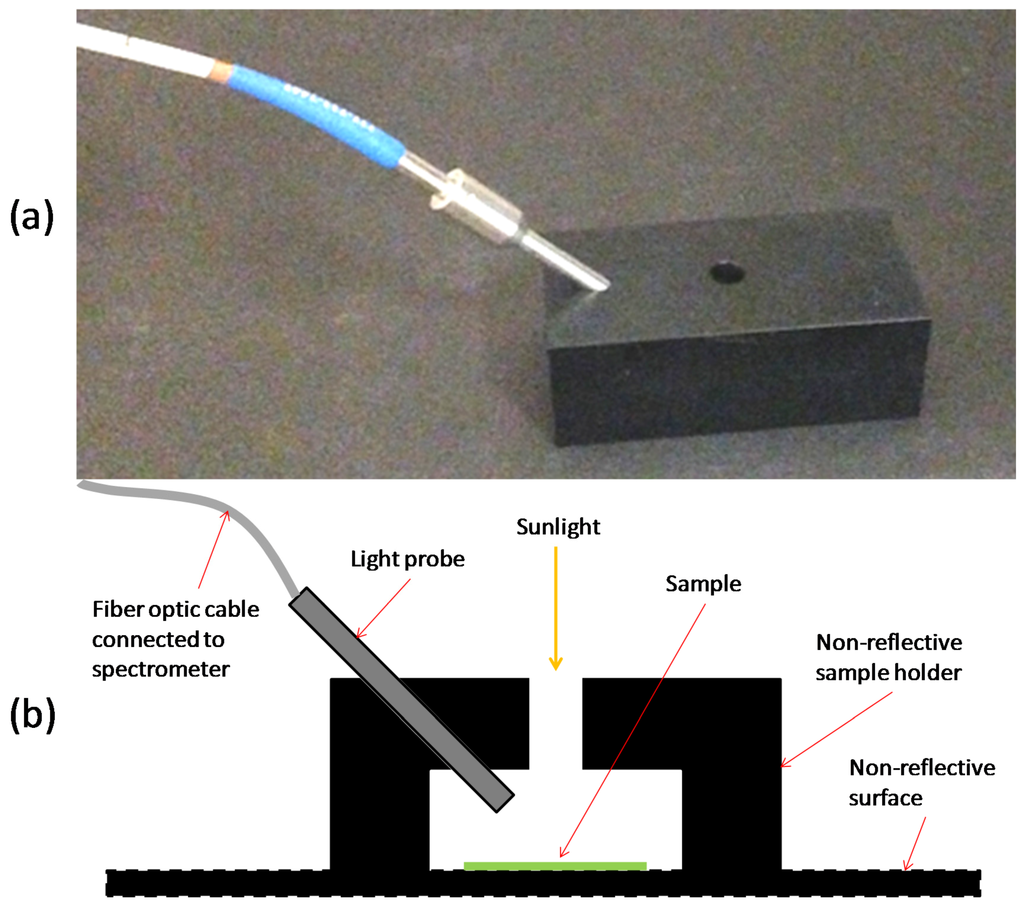 Harvested and prepared leaf samples were placed on a non-reflective material and scanned in a field, at the Beltsville Agricultural Research Center, under direct sun light. Samples were placed under a reflection probe holder (RPH-1, OceanOptics, Oxford, UK), which allows the sun’s radiation to be focused on a 10 mm diameter circular section of the leaf and for the response to be detected at a 45° angle using a fiber optic probe and cable (QR600-7-UV-125F, OceanOptics) connected to a spectrometer (USB2000, OceanOptics; Figure 1).