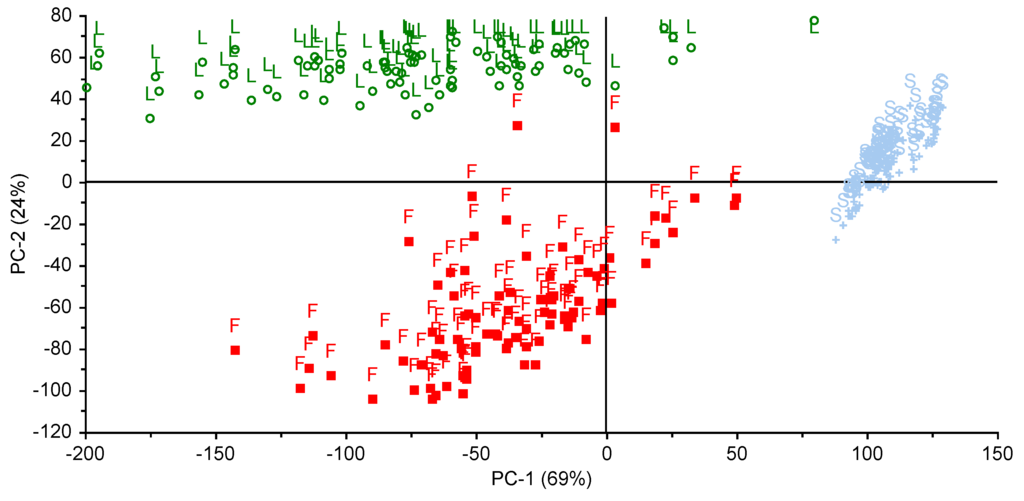 Principal component analysis scores plot of showing PC1 (principal component 1) vs. PC2 using spectra from 368 to 1048 nm. ▪ and F, fecal matter on leaf; + and S, soil on leaf; o and L, uncontaminated leaf.