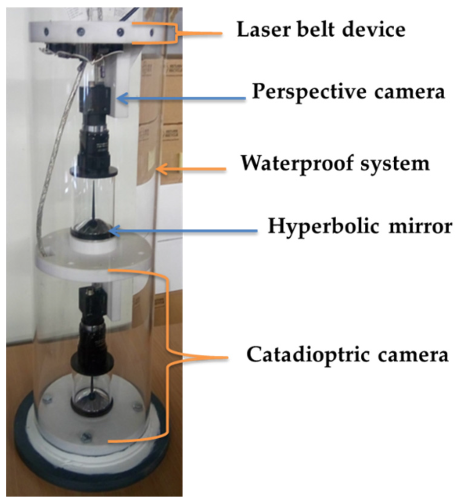 In our work, we go towards an observation of the entire robot’s environment with the use of minimum cameras to avoid occlusion and dead angles. We propose a stereo catadioptric system (Figure 1) mounted with a belt of twelve equidistant laser pointing devices (Apinex.Com Inc., Montreal, Canada). The catadioptric system consists on a Point Grey’s Flea2 camera (Point Grey Research Inc., Richmond, BC, Canada) pointing at a hyperbolic mirror (V-Stone Co., Ltd., Osaka, Japan). The laser pointer is a typical pen-shape of 532 nm wavelength laser pointer. In order to ensure the sealing of the cameras, we insert the catadioptric systems and the lasers into a tight waterproof system.