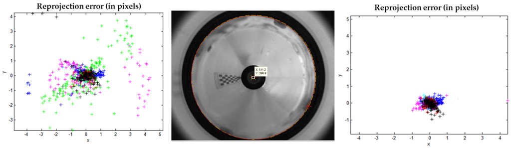 We use the generalized parametric modelisation described and detailed by Scaramuzza et al. in [45]. They propose a generalized approximation that relates 3D coordinates of a world vector and its 2D image projection. It consists on a polynomial approximation function denoted "f" which is defined through a set of coefficients {a0; a1; a2; a3; ….} as given in expression (Equation (1)). The calibration process is done once-time in off-line mode and the resulting coefficients will be used as variable inputs for the 3D reconstruction algorithm. The 2D coordinates (u, v) represent the pixel coordinates of a feature point extracted from an image with respect to the principal point (u0, v0). This latter is considered, at first, as the image center to generate a first parameter estimation. Then, by minimizing the re-projection error using the iterative RANdom SAmple Consensus (RANSAC) algorithm [46], the exact coordinates of the principal point is determined. This permits to highlight the misalignment between the optical axis of the camera and the axis of the mirror which allow refining the estimation results (Figure 2).