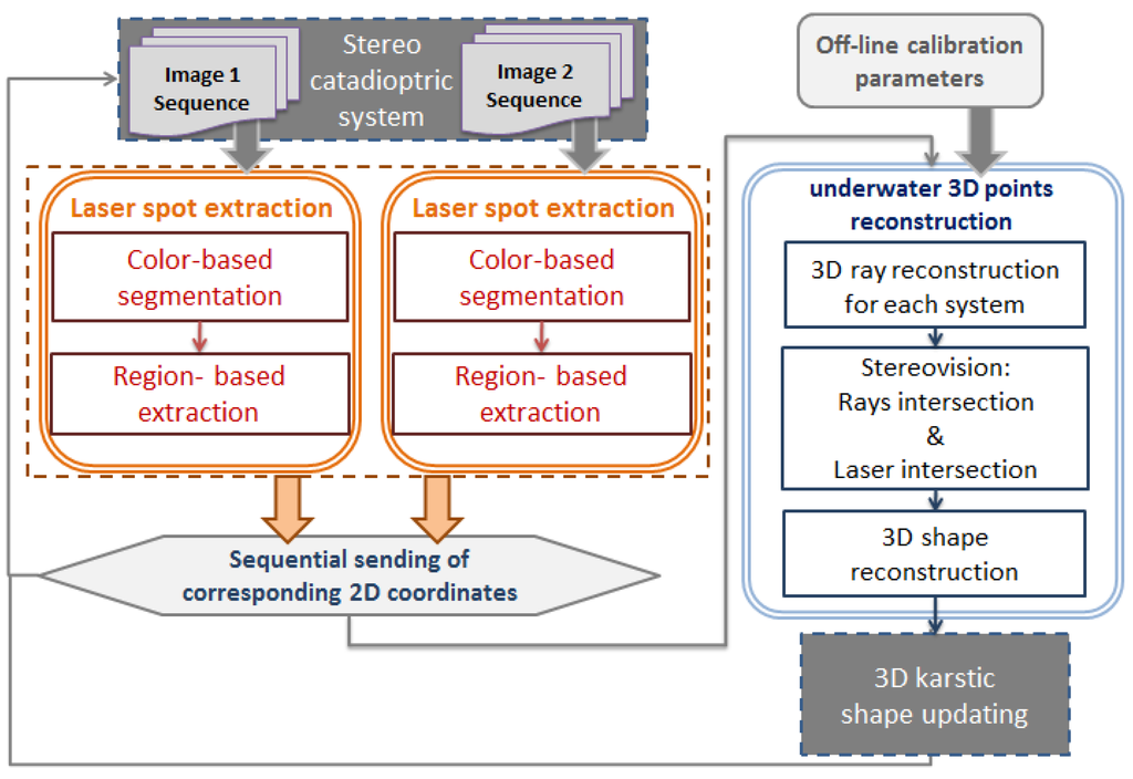 The system inputs are the omnidirectional images acquired both in the same time at each position of the exploration robot and the calibration parameters which were estimated off-line and used as input variable data. The first processing block includes initially morphological operations based on color pixel information in order to highlight the laser spot projection with respect to the rest of the image and then a specific based-region process applied to identify and then extract the laser projection 2D coordinates in each image. This block is designed twice for each camera image sequence. The second processing module (3D underwater shape reconstruction) contains first the 3D ray reconstruction based on 2D coordinates and the calibration parameters. Then, the 3D shape of the karst is determined using the 3D coordinates obtained by the intersection of the stereo rays and the 3D coordinates obtained by the intersection of generated ray vectors corresponding to each system and the laser beams directions. After each 3D underwater shape generation, new stereoscopic images are acquired and sent to be processed. Since the first and second processing blocks are totally independent, we can execute them in a parallel way: either on a fully hardware processing or through a Sw/Hw design. In the following sections, we present in more details the key processing steps: laser spot extraction and underwater restitution of the 3D shape coordinates. Then, we present the complete workflow of the processing chain.
