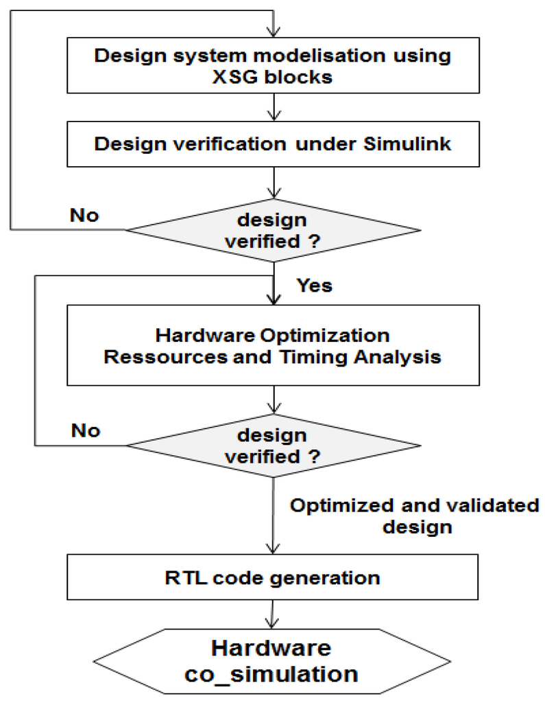 Figure 7 presents the processing flow of System Generator tool from the hardware architecture design to the generation of the reconfiguration file used for the RTL (Register Transfer Level) design generation and the co_simulation process. The architecture designed using XSG blocks will be simulated under Simulink to compare calculation results obtained by the Matlab code algorithm and those obtained by the designed hardware module.