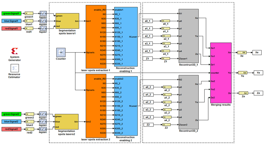In our work, by taking profit from pipeline to decrease the latency, the operating frequency has been increased to 275.18 MHz. We used two standard IEEE-1394b FireWire cameras (Point Grey Research Inc., Richmond, BC, Canada). The maximum pixel clock frequency could reach 66.67 MHz, which corresponds to a pixel period of 15 ns. The maximum FPS (frames per second) of the camera is 30 FPS at a maximum resolution of 1024 × 768. This means that between two frames, it exists a period of T = 33 ms. The system should respond during this period in order to satisfy the application constraints. The proposed XSG architecture for the pre-processing and laser spots extraction presents a total latency of 1024 × 768 clock cycles (the resolution of the image). The 3D reconstruction module, which is designed to be looped twelve times to generate the 3D coordinates of the 12 laser pointers presents a total latency of 1200 clock cycles.