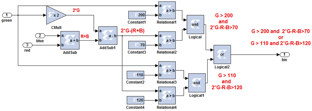The laser spots detection algorithm consists on highlighting the laser projection on the stereo RGB images in order to easy the extraction of the corresponding 2D coordinates. The first step is the binarisation of the RGB images based on pixel color information. White pixels will represent the laser projections and black ones the background. In Figure 9, we propose the hardware architecture of the segmentation step, which correspond in fact to the expression (Equation (2)) given in Section 4.2.