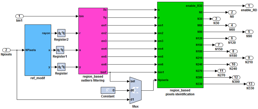 (6) Use of XSG tool for hardware implementation: During the algorithm development, we attempt to propose an architecture considering maximum use of parallelism. For the hardware implementation validation of the pipelined architecture, we use System Generator interface provided by Xilinx. The main advantage of XSG use is that the same hardware architecture will be used first for the software validation and then for performances evaluation.