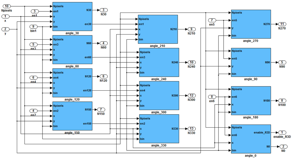 In order to eliminate wrong laser projections, we use an approach based on region constraints. All pixels that are white (‘bin’ = '1'), that are inside the mirror projection {‘r‘ < ‘Rmiroir’}, and that the relation between x and y coordinates is close to one of the predefined set, or belonging to the region where the x coordinates is negative (x < 0) are considered to form a cloud points. A selection is applied to choose which laser projection will be considered as an object and which will be merged with the image background. This is done by analyzing the values of the polar and Cartesian coordinates of each laser pixel. For a pixel belonging to a direction whose inclination angle is "ϴ", its (x, y) coordinates are proportional to the "arctangent (ϴ)" value. In our work, we use twelve laser pointers, which let us define twelve directions corresponding to ϴ Є {0, 30, 60, …, 330} corresponding to the arctangent value Є {±0.577, ±1.732} and pixels belonging to the vertical axis {−3 < y < 3} and horizontal axis {−3 < x < 3}. Because of the symmetry of the arctangent function, two faced region is described by the same arctangent value. To differentiate between the two regions, we analyze the signs of the (x, y) coordinates (Figure 4b). Twelve selection blocks are designed to specify each region of the image (Figure 11). Each block contains the region characteristics defined to sort pixels which are identified as laser projection. For the gravity center calculation, we use a "MCode" blockset inserted to determine the median position value of all entering pixel values of a cloud points for each region.