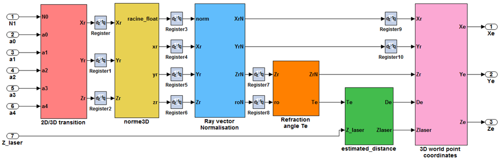 The "Pe" coordinates are proportional to the 3D ray vector r (Xr, Yr, Zr), to the distance between the laser projection and the optical axis of the stereo cameras "De" and to the laser beam position. We re-use two 32-bit division subsystems of real numbers division and a 32-bit HDL code for the square root approximation function. The outputs ports are changed from std_logic_vector into Fix_32_14 data type.