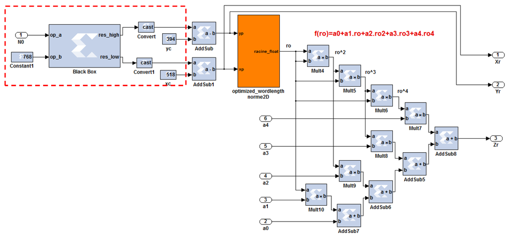 Using XSG development tool, maximum precision could be obtained by configuring all blocks, between the gateways, to run with a full output type. However, this could lead to an impossible synthesis result. Word-length optimization is a key parameter that permits to reduce the use of FPGA hardware resources while maintaining a satisfactory level of accuracy. In the case of square root approximation, word-length is hard to compute since output format increase by the looped algorithm feedbacks. For that reason, successive simulation reducing iteratively outputs word length is made until achieving the minimum world length while ensuring the same maximum precision.