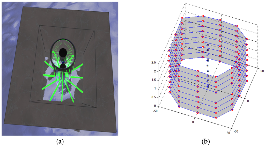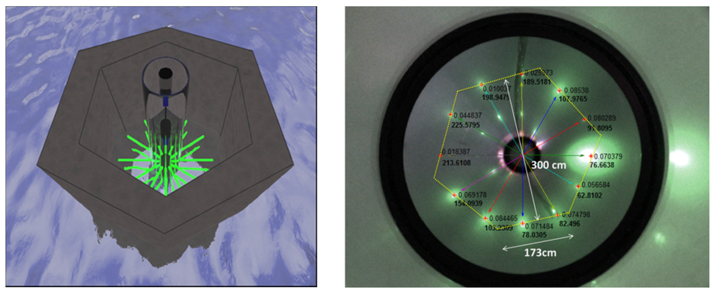 The main functionality of to the developed system is to make 3D reconstructions of a confined dynamic underwater environment while giving accurate metrics based only on acquired images (1024 × 768 pixels). In the validation and evaluation of the developed system accuracy, we use examples of simple geometric shapes with known dimensions. The evaluation tests were made in a specific water pool built in our laboratory of a width of 3 meters. Tests could be made on the pool itself or throughout different tubes (forms) introduced in the pool. In each experimental test, dozens of camera positions are used for evaluation. The obtained pairs of images are processed and the estimated distances are compared to the real ones corresponding to these known camera positions. In Figure 14, we present an example of simulation results performed in the hexagonal pool. The lasers pointing at the cross section of the object are projected in the stereo images (Figure 14a). The binary stereo images, obtained using the thresholding expression, highlights the laser projections with respect to the background (Figure 14b). Only the defined image-regions are covered in order to extract unique 2D coordinates of the laser spot on each region. Laser projections belonging to the same image region are matched (Figure 14c) and sent to the triangulation process to determine the 3D distances corresponding to each laser (Figure 15). The mean error scale of distance measurements, for the different objects used in experimentation, is of 2.5%. For the hexagonal object, the mean square error is about 5.45 mm2 which is quite satisfactory regarding bad resolution of underwater images and light refraction effects.