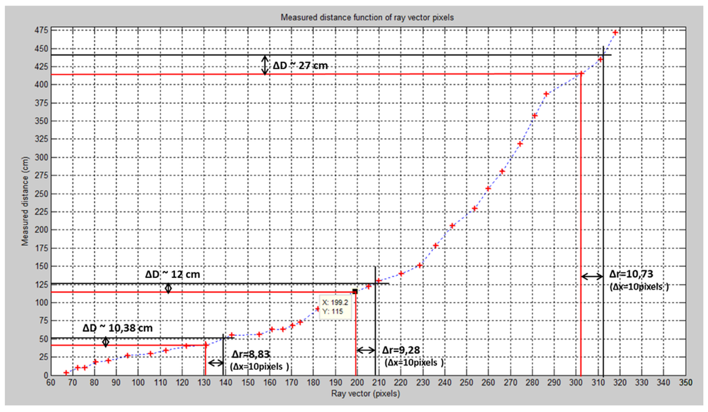 Error between estimated distances and real measurements could be caused either because of calibration error, XSG blocks optimization or because of laser spot center detection errors. Analyses of the spot center accuracy detection influence on 3D distance results were also performed. Figure 16 illustrates distance measurements with respect to the gravity-center positions for different real measurements (up to 480 cm). To be able to evaluate the effect of the error on the spot center detection (in terms of pixel position) on the resulting distance, we can use the curve of Figure 16. This curve gives the distance function of spot center position (polar coordinate ). For a reference spot distance, we can determine the distance error by varying the pixel coordinates. Table 2 gives an example of error evaluation for three points with a variation of ∆x = 1 pixel and ∆x = 10 pixels. For distances measures up to 480 cm, the maximum relative distance error is about 1.3%.