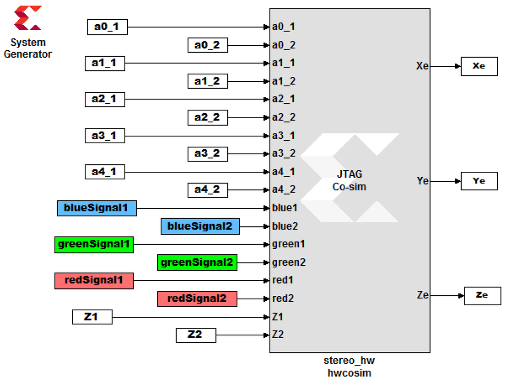 To implement the design on FPGA, ISE tool and core generator automatically generate a programming bit file using the System Generator blockset. A system block is created to point into the configuration file (bit) for the co_simulation. The generated co_simulation block (Figure 17) replaces the XSG model (Figure 8) and will be loaded on the FPGA device through the JTAG cable by closing the loop after connecting the board (Xilinx ML605).