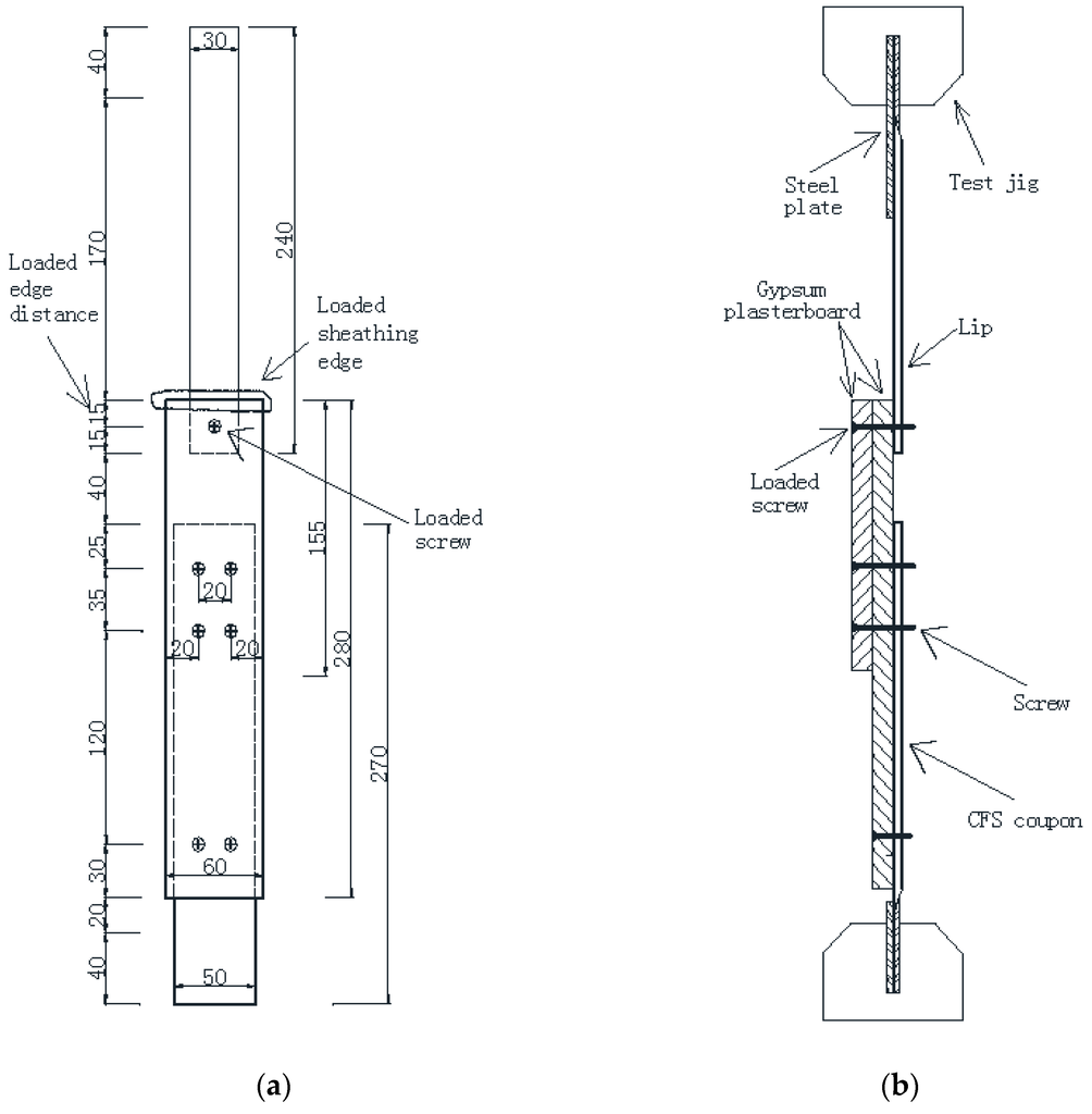 Limited to the cavity dimensions of the furnace, the single-lap test of the CFS coupon-fastener-sheathing connections (Figure 2 and Figure 3) was adopted in this paper. Compared to the test scheme of multi-screw stud-fastener-sheathing connections [6,7], the loaded sheathing edge of the coupon-fastener-sheathing connection had only one screw. Hence, high accuracy for the specimen assembly was easy to achieve, especially for the loaded edge distance, which might have an important influence on the shear behavior of screw connections with sheathing. According to the AISI design manual [17], the minimum distance of the loaded sheathing edge is 9.5 mm in the United States and 12.5 mm in Canada. Therefore, three loaded edge distances (10, 15 and 20 mm) were considered in the experiments. In addition, single and double layers of 12.5 mm thick fire-resistant gypsum plasterboard were attached to 1.0 mm thick G550 cold-formed steel by self-drilling bugle head screws. The screw diameter was 4.2 mm, which is the minimum size for screw connections of CFS structures in the Chinese design guide [23]. As shown in Figure 2 and Figure 3, the lip was designed for the CFS coupon to avoid the out-of-plane curling of CFS sheets that was found in the previous shear experiments of CFS sheet-fastener-sheet connections [19], and this might affect the failure mode of the connections. In addition, two pieces of steel plates (Figure 2b and Figure 3b) were used to grip the CFS coupon to restrict the out-of-plane deflection of CFS coupons at the testing rig.