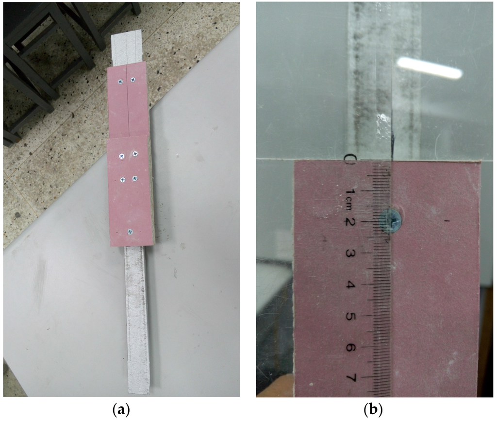 Before assembly of the screw connection, the gypsum plasterboard needs to be cut into pieces and manually polished to ensure the smoothness of the loaded sheathing edge. Next, small holes were drilled by a 2 mm diameter drill bit for the gypsum plasterboard pieces and the CFS coupon at the location of the loaded screw (Figure 2 and Figure 3). Then, the gypsum plasterboard pieces and CFS coupon were fixed together using a screw to form the screw connection. Finally, the loaded edge distance of the assembled specimen was checked and adjusted by art knife, if necessary. Figure 4a shows a specimen with double layers of gypsum sheathing, and Figure 4b shows the verification of the loaded edge distance (20 mm) for that specimen.