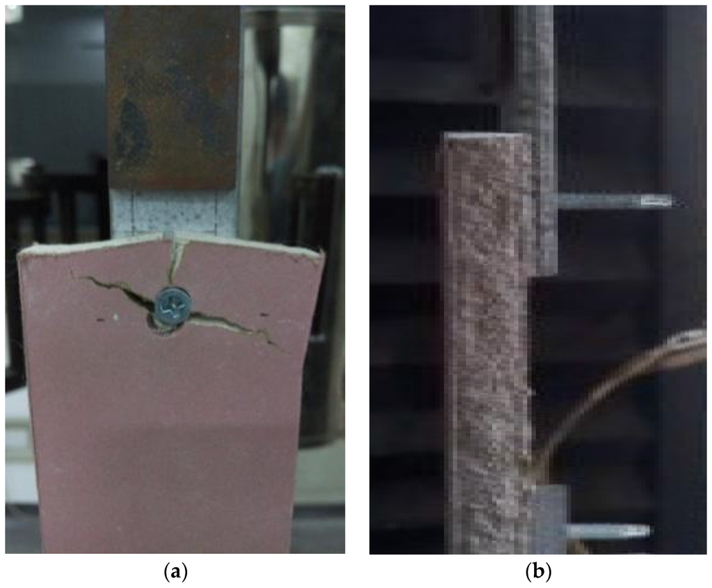 Several experimental investigations [3,4,5,6,7,8,9] have already been conducted on the shear response of screw connections with gypsum sheathing or other board materials at ambient temperature. Gypsum sheathing does not have a preferential material response in a specific direction [7], and the failure of screw connections with single-layer gypsum sheathing was mainly identified as breaking or bearing of the loaded sheathing edge [6,7,8]. Furthermore, the effect of the loading rate, steel thickness, loaded edge distance and loading protocol were also discussed with explicit conclusions [5,6,7,8,9]. Some mathematical models, such as the Foschi model [10], Pivot model [9,11] and Pinching 4 model [7], were used to describe the monotonic or cyclic load–displacement characteristic of connections at ambient temperature.