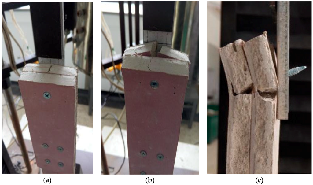 The failure process of GPB20D-20: (a) cracking of the base layer gypsum plasterboard on the loaded edge; (b) failure of the base layer gypsum plasterboard; and (c) B + T + F failure.