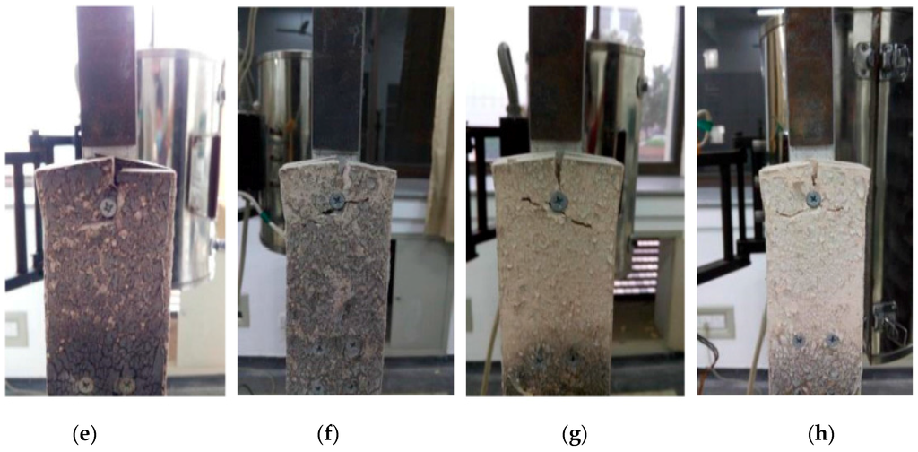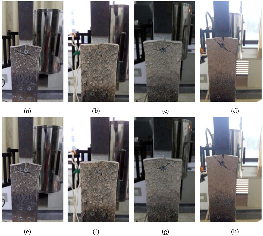 Failure modes of GPB20D series at elevated temperatures: (a) 150 °C; (b) 200 °C; (c) 250 °C; (d) 300 °C; (e) 350 °C; (f) 400 °C; (g) 450 °C; and (h) 500 °C.