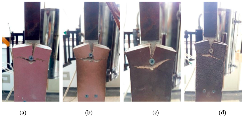 For the connection series with double-layer gypsum sheathing, the double length of the screw arm, which is the perpendicular distance from the screw’s bugle head to the CFS coupon, resulted in the occurrence of screw tilting at a low shear load. With increasing screw tilt, the loaded sheathing edge suffers additional out-of-plane bending. Therefore, except for the breaking of the loaded sheathing edge, the connection series with the double-layer gypsum sheathing also displayed obvious screw tilting and sheathing flexing fraction at ambient temperature (Figure 7). Again, the screw tilting and sheathing flexing fraction disappear gradually at elevated temperatures (Figure 10) due to the degenerated shear strength.