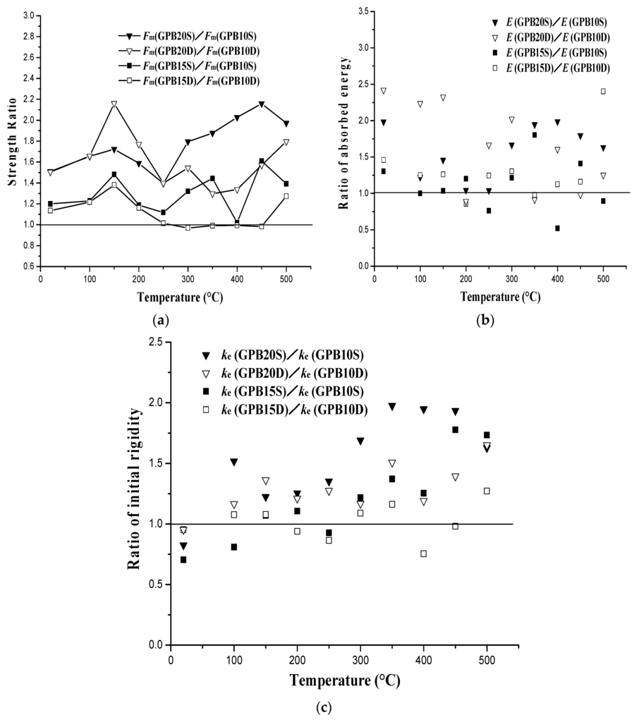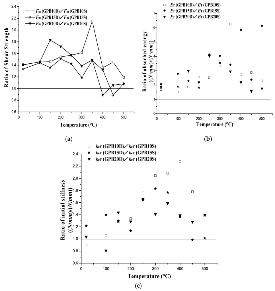 Figure 12 shows the ratio of the test results of the fastener series with double-layer sheathing to those of the series with single-layer sheathing. In Figure 12a, except for the GPB20 series at 400 °C and GPB15 at 450 °C, the shear strength of the other series increased when replacing the single-layer sheathing with double layers of gypsum plasterboard. Most of the ratios for the shear strength fell between 1.2 and 1.6. In Figure 12b, the absorbed energy capacity of the connection with double layers of gypsum plasterboard was much higher than that of the connection with single-layer sheathing. Most of the ratios for the absorbed energy were above 2.0. Moreover, replacing single-layer gypsum sheathing with a double layer of gypsum plasterboard had an insignificant effect on the initial connection stiffness at ambient temperature, but the effect became favorable beyond 100 °C with an average ratio of approximately 1.5.