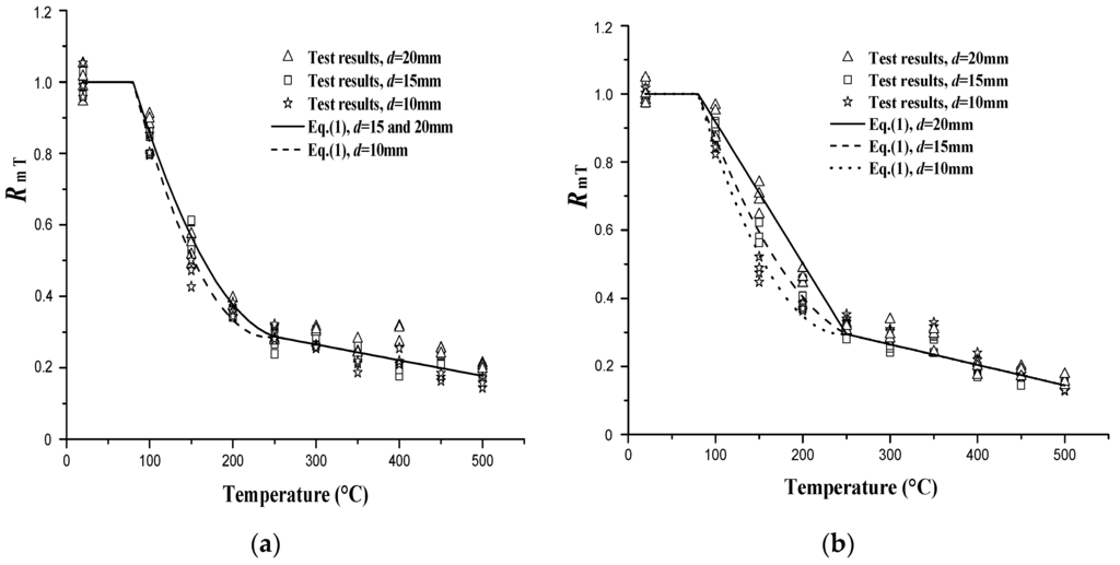 A unified prediction formula for FmT was proposed by non-linear regression, as shown in Equation (1), where d represents the loaded edge distance; α is the coefficient that considers the effect of double-layer gypsum sheathing at ambient temperature, as shown in Equations (2) and (3); and RmT is the reduction factor of shear strength, defined as the ratio of the shear strength at elevated temperatures to that at ambient temperature. RmT is developed by the multi-segment polynomials, as shown in Equation (4). The values of the coefficients in Equation (4) are given in Table 3. Based on the previous thermal physical experiments of fire-resistant gypsum plasterboard at elevated temperatures [21], the dehydration of gypsum plasterboard (CaSO4·2H2O) occurred from approximately 85 °C to 160 °C. Therefore, RmT is assumed to be 1.0 for temperatures below 80 °C in Table 3. The RmT predicted by Equation (4) is in good agreement with the values obtained from the present experiments, as shown in Figure 13.