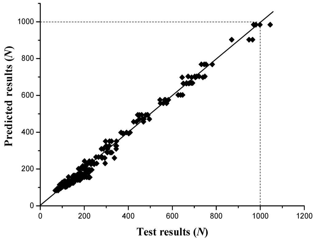 Figure 14 compares the values of FmT predicted by Equation (1) to those obtained from the present 200 experiments. The average ratio of the predicted FmT to the experimental results is 98.8%, and the Pearson product-moment correlation coefficient is 0.995. Thus, Equation (1) is able to accurately evaluate the shear strength of the screw connection with single- or double-layer gypsum sheathing and different edge distances at ambient and elevated temperatures. In structural engineering design, if the loaded edge distance exceeds 20 mm, Equation (1) can still be used with the loaded edge distance of 20 mm to obtain a conservative prediction of the shear strength of the screw connection, and a factor of safety [25] can be applied to the maximum allowable axial strength of the screw connection, as shown in Equation (5).