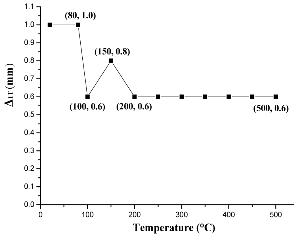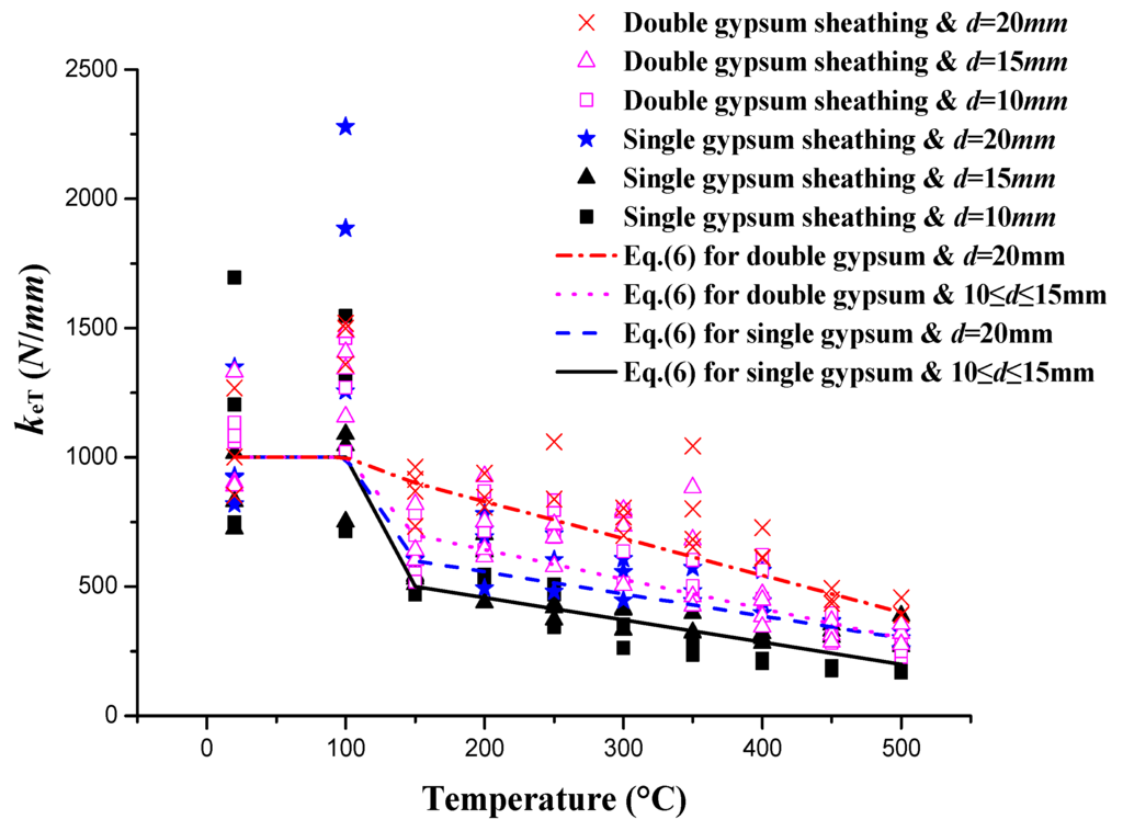 Equation (7) is the prediction formula of ΔmT, which takes the larger value of of FmT/keT and α1·Δ1T. FmT and keT can be obtained from Equations (1) and (6), respectively. Δ1T is the predicted displacement corresponding to FmT for the screw connection with single-layer gypsum sheathing at T °C. Figure 16 gives the values of the predicted Δ1T based on the present experiments. α1 is the coefficient that considers the effect of double-layer gypsum sheathing on ΔmT, as shown in Equations (8) and (9). As shown in Table 2, the test results of ΔmT for the connection series with double-layer gypsum sheathing and a loaded edge distance of 20 mm were much lower than those of the series with double-layer gypsum sheathing and a loaded edge distance of 15 or 10 mm for temperatures beyond 250 °C. This phenomenon seems unusual, and it was not considered in Equation (9).