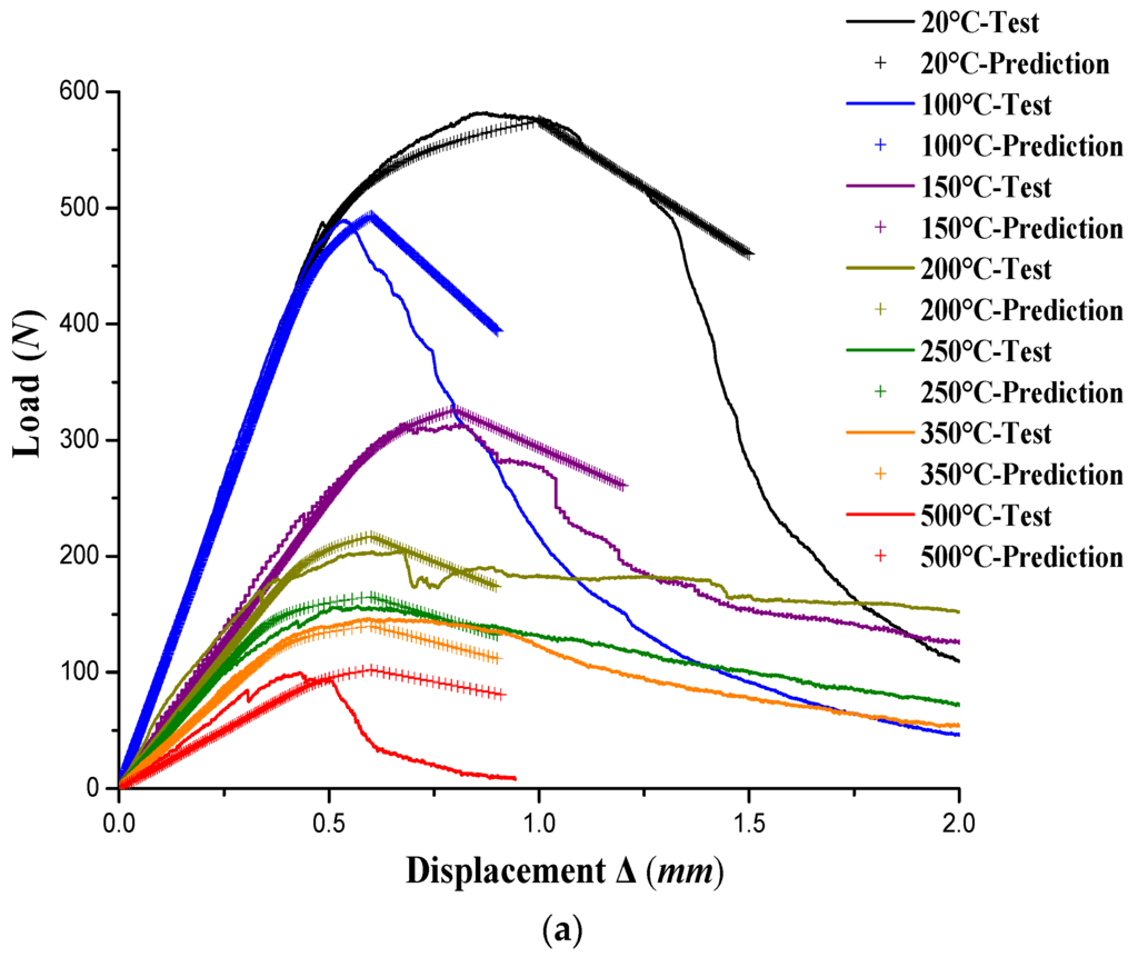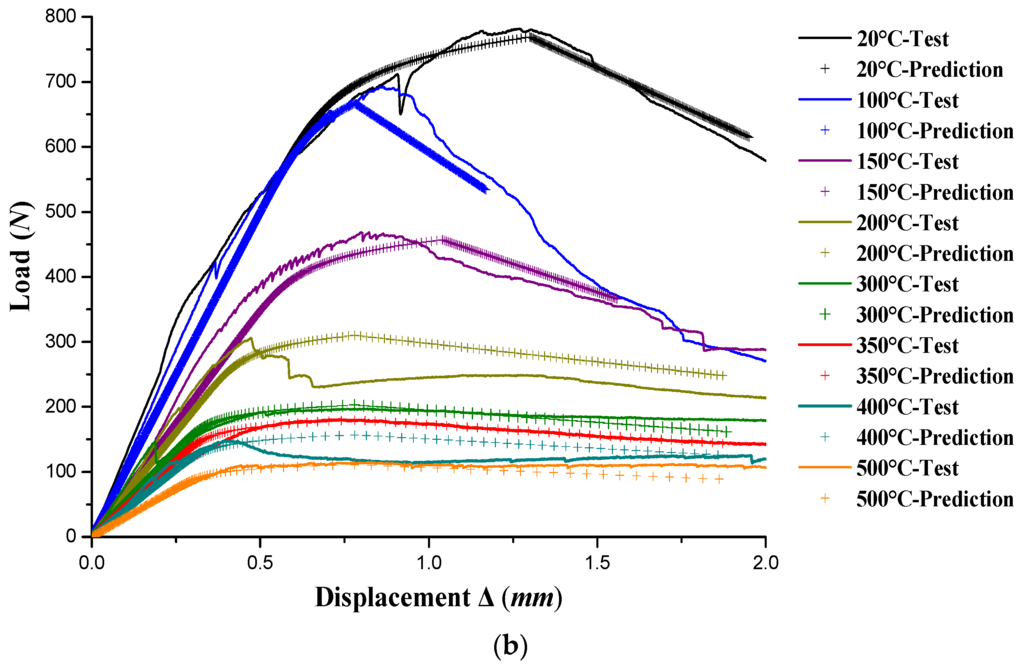 The load–displacement curves of the screw connections at ambient and elevated temperatures are important input parameters for the elaborate simulation of the mechanical performance of CFS walls at ambient temperature or in fire conditions. A four-line degradation model was adopted by Ye et al. [9] to predict the load–displacement curve of the connection at ambient temperature. However, the four-line degradation model has at least eight parameters, and it is not easy to operate. The Foschi exponential model [10] can also be used to describe the load–displacement characteristic of the connection at room temperature, but it becomes inconvenient at elevated temperatures due to its irregular change in parameters. Based on the above prediction formulas for FmT, KeT, ΔmT and ΔuT, a simplified load–displacement model with the post-peak branch was developed for the screw connection at both ambient and elevated temperatures, as shown in Equation (13). The pre-peak branch of the load–displacement model was obtained by modifying the Ramberg-Osgood model [26]. The post-peak branch showed a linear decrease from ΔmT to ΔuT. To simplify the operation, the exponent A in Equation (13) was given a constant value for the fastener series with the same configuration and elevated temperature, as shown in Table 5.