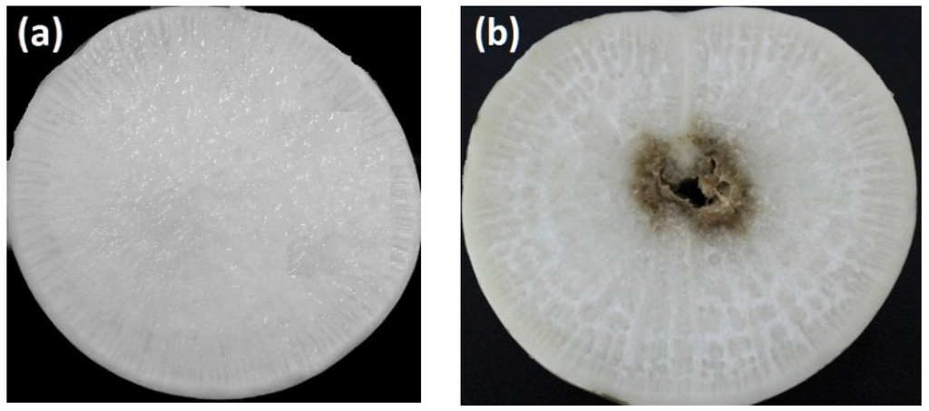 Normal (a); and defective (b) (with black heart) slices of radishes.