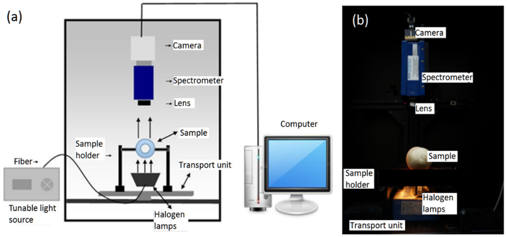 Figure 2 shows the hyperspectral transmittance imaging system used in our study, with a schematic diagram in Figure 2a and a physical map in Figure 2b. The system consisted of hardware and software components. The hardware component was composed of: a charge-coupled device (CCD) camera (ICL-B1620, Imperx, Boca Raton, FL, USA), a spectrometer (ImSpectorV10E, Spectral imaging, Oulu, Finland) with spectral resolution of 2.8 nm, a variable-focal-length lens, two halogen lamps connected using optical fiber with a direct-current, tunable light source (150 W halogen tungsten lamp controller, 3900ER, Illumination Technologies Inc., East Syracuse, NY, USA), transport unit with a sample holder station, an electronically-controlled, motorized horizontal stage (IRCP0076-ICOMB001, Isuzu, Zhubei, Taiwan), and a computer (Intel E5800 3.2 GHz CPU, 2GB RAM, 256 MB GeForce GT240 GPU, Dell, Round Rock, TX, USA). In order to acquire the transmittance images, the two 90 W halogen lamps were fixed directly below the sample (Figure 2b). The speed of the transport unit and exposure time was set at 2.5 mm/s and 70 ms, respectively. Software developed by Isuzu Optics Corp. (Zhubei, Taiwan) was used for image acquisition and parameter setting. The imaging spectrograph worked in line scanning mode and covered the spectral range of 400–1000 nm.