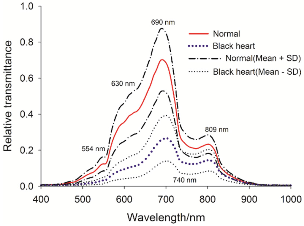 Figure 3 shows the mean relative transmittance spectra and standard deviations (SD) extracted from the ROIs of normal and black-heart white radishes covering the spectral range of 400–1000 nm. The relative transmittance for samples of both classes increased over the spectral range of 400–690 nm, except for two small valleys at 554 nm and 630 nm. The transmittance decreased sharply from the peak at 690 nm to another lower valley at 740 nm, then increased slightly to a peak at 809 nm, then fell rapidly between 809 nm and 1000 nm. Comparing the relative transmittance spectra between normal and black heart radishes, apparent differences exist in the mean relative transmittance spectra from 500 nm to 900 nm; for instance, a difference of 0.44 in the peak at 690 nm. There was strong absorption in the wavebands of 400–500 nm and 900–1000 nm for all samples. Therefore, the difference between normal and black heart samples provided substantial spectral information for black heart detection and classification.