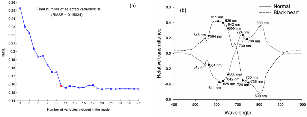 SPA was first used for the selection of the optimal wavelengths for the discrimination of black- heart white radishes, followed by preprocessing with SNV and mean center. During the SPA selection procedure, the SPA-MLR procedure was used to acquire the RMSE values based on the selected variable subsets. In the toolbox, the maximum number of variables selected by SPA was set as 27, because the number of variables reached 27, the RMSE value was lowest. As shown in Figure 4a, the RMSE values gradually decreased as the number of selected wavelengths increased from 1 to 11. When the number exceeded 10, RMSE did not perceptibly change. Using 10 selected wavelengths for the MLR model (solid square markers), the root mean square error (RMSE) reached its optimal values (0.15834) for the two-class discrimination. The selected ten optimal wavelengths designated by open or solid circle markers and their distribution in the typical preprocessed spectral curves are shown in Figure 4b. Figure 4b shows the spectral curves of single normal and black-heart radishes respectively after preprocessing using SNV+ mean center. In order of importance in the projection procedure, the wavelengths were 642, 629, 655, 730, 611, 809, 724, 738, 545 and 564 nm.