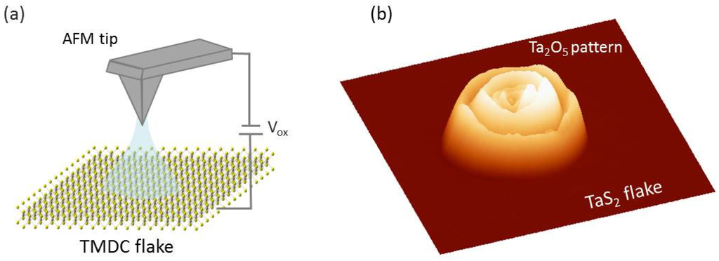 - Coronado, E.; Forment-Aliaga, A.; Navarro-Moratalla, E.; Pinilla-Cienfuegos, E.; Castellanos Gomez, A. Nanofabrication of TaS2 conducting layers nanopatterned with Ta2O5 insulating regions via AFM. J. Mater. Chem. C 2013, 1, 7692–7694. [Google Scholar] [CrossRef]
