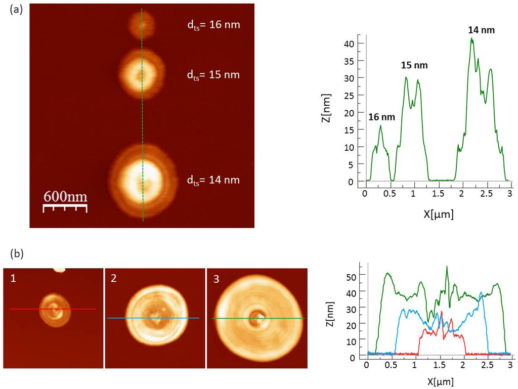 As observed for other materials [], it was also found that there is always a threshold potential from which the oxide started to form. Then, at a constant tip-sample distance, the size of the whole pattern is governed by the pulse time duration (tox). In Figure 2b it is shown a set of three oxidized dots performed at dts ~13 nm and voltage pulse, Vox = −21 V, with increasing time of oxidation 100 ms, 200 ms, 300 ms, respectively. The formations grew in number of rings, height and width as the pulse time was increased.